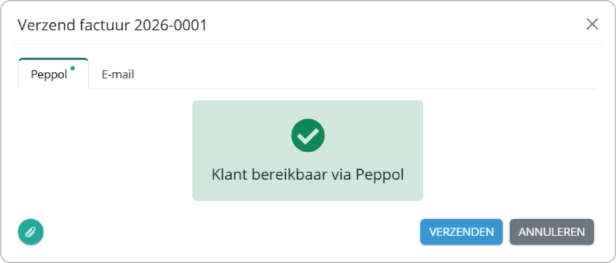 Selecteer vervolgens of je de factuur via Peppol of per e-mail wilt verzenden. Is de klant bereikbaar via Peppol, dan zie je een groen bolletje. Is de klant niet bereikbaar via Peppol, dan wordt dit aangeduid met een rood bolletje.