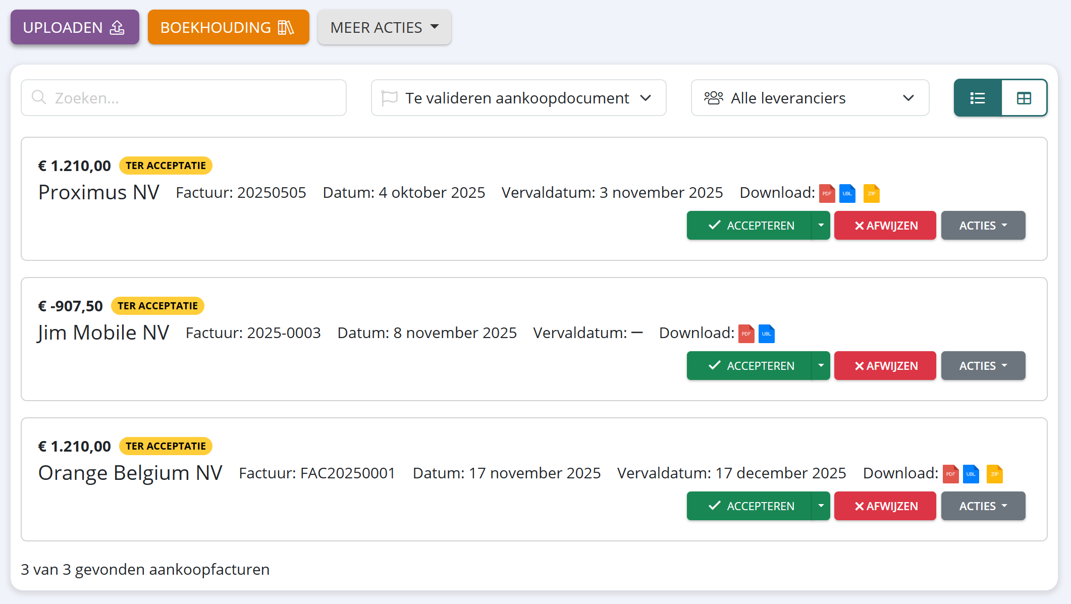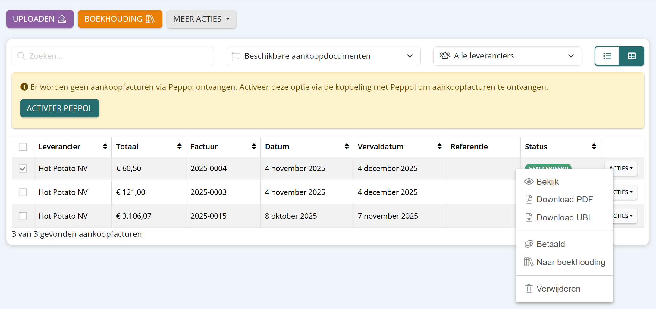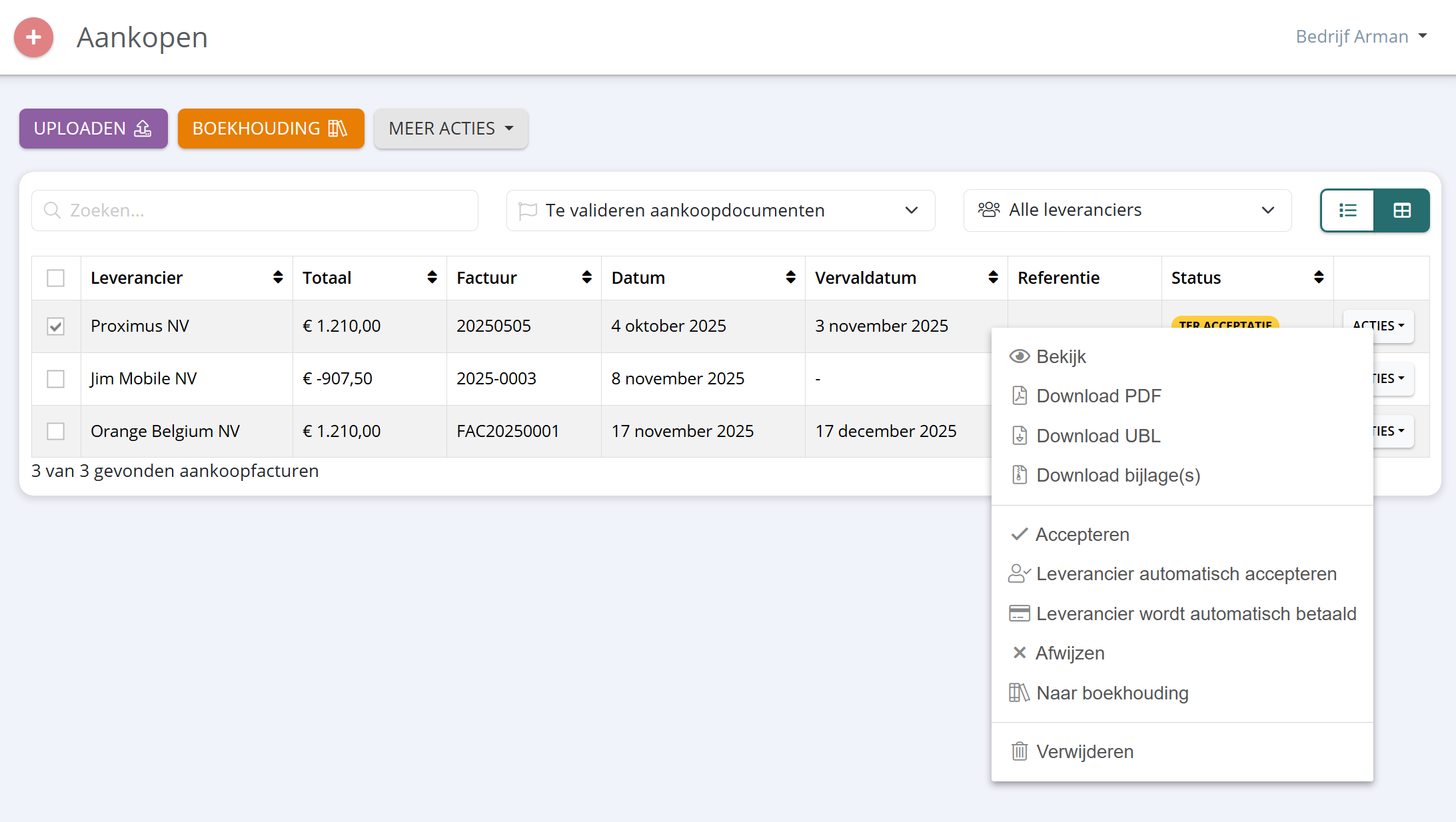 Nu de aankoopfacturen zijn binnengekomen, kun je een factuur accepteren door rechts in de kolom op Acties te klikken en Accepteren te kiezen. Je aankoopfacturen kunnen pas naar de boekhouding worden verzonden nadat ze zijn geaccepteerd.