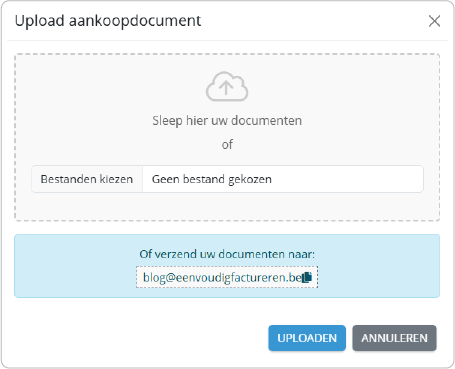 Sleep je bonnetjes, PDF’s, afbeeldingen, UBL’s of andere documenten rechtstreeks in het uploadvenster, of klik op Bestanden kiezen om ze handmatig te selecteren. Liever via e-mail? Stuur je documenten gewoon naar [je persoonlijke inboxadres], en ze verschijnen automatisch in je Aankopen-overzicht. Van daaruit kun je ze verder verwerken, basisinformatie toevoegen en in één klik doorsturen naar je boekhouding. Eenvoudig, overzichtelijk en volledig geïntegreerd binnen EenvoudigFactureren.
