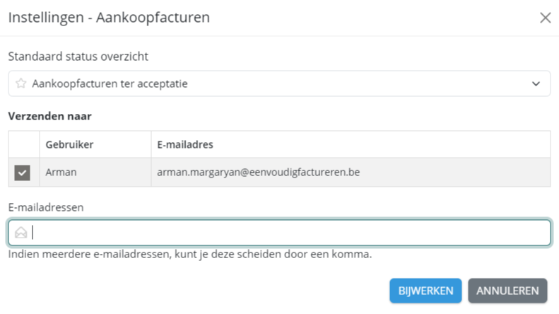 Om ervoor te zorgen dat je op de hoogte blijft van nieuwe aankoopfacturen, kun je in de instellingen aangeven wie de e-mails van nieuwe aankoopfacturen ontvangt. Zodra een nieuwe factuur binnenkomt via Peppol, ontvangen de opgegeven gebruikers een e-mailmelding.