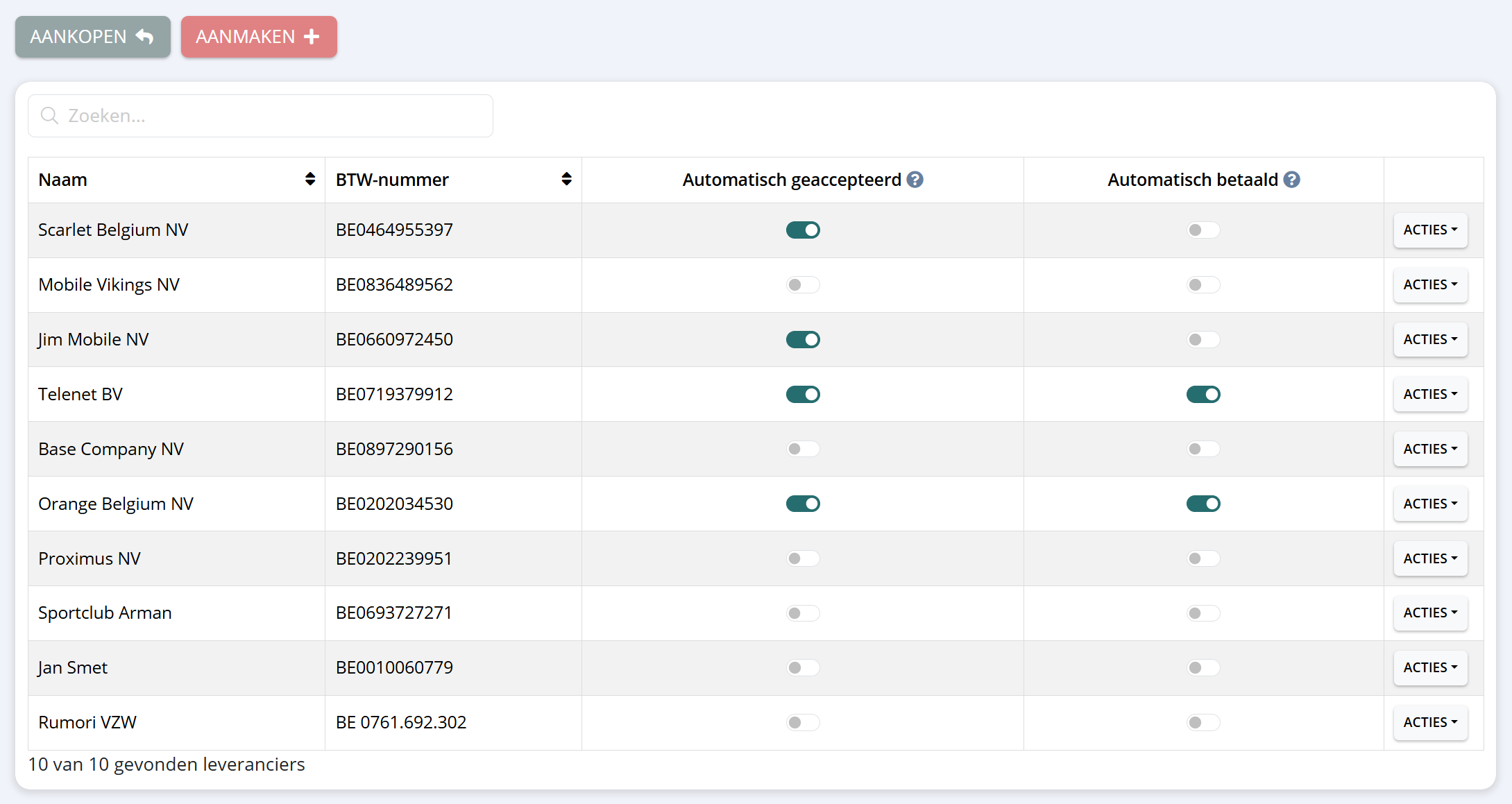 Een andere belangrijke vernieuwing is het beheer van leveranciers. Binnen de vernieuwde Aankopen module krijg je nu een duidelijk overzicht van al je leveranciers, inclusief btw-nummers en instellingen voor automatische verwerkingen. Je kunt per leverancier instellen dat aankoopfacturen via Peppol: Automatisch geaccepteerd worden zodra ze binnenkomen, en/of Automatisch als betaald worden gemarkeerd zodra ze verwerkt zijn. Zo hoef je niet langer elke Peppol factuur manueel na te kijken of goed te keuren. Alles verloopt automatisch volgens jouw voorkeuren. Je vindt de leveranciers pagina via Meer Acties en vervolgens op Leveranciers.