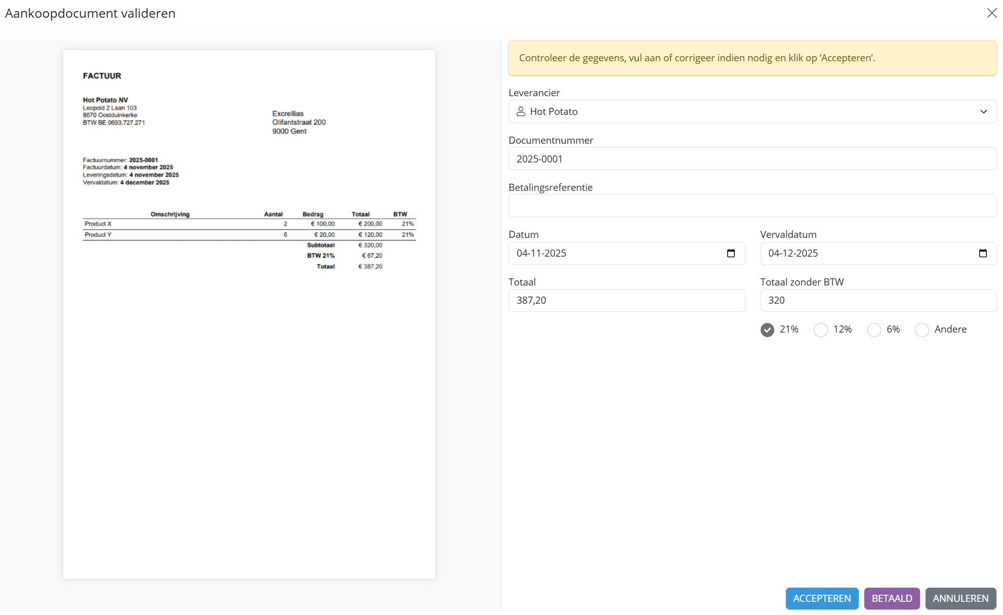 Wanneer je een aankoopdocument uploadt, wordt het automatisch geanalyseerd door onze vernieuwde AI. Deze leest de belangrijkste factuurgegevens zoals: leverancier, factuurnummer, datum, totaalbedrag en btw rechtstreeks uit het document en vult deze velden automatisch in. Controleer en corrigeer de gegevens indien nodig, en klik op Accepteren om het document te verwerken.