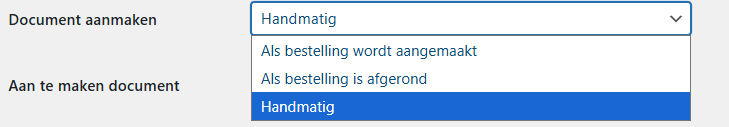 - Als bestelling wordt aangemaakt: Het document wordt direct aangemaakt zodra de bestelling geplaatst wordt.